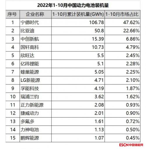 2022年1-10月,我国动力电池装机量224.2GWh,同比增长108.7%。其中三元电池装机量88.0GWh,占总装机量39.2%,同比增长62.8%;磷酸铁锂电池装机量136.0GWh,占总装机量60.6%,同比增长155.6%,呈现快速增长发展势头。1-10月,我国新能源汽车市场共计51家动力电池企业实现装机配套,较去年同期减少3家,排名前10家动力电池企业装机量211.9GWh,占总装机量94.5%。