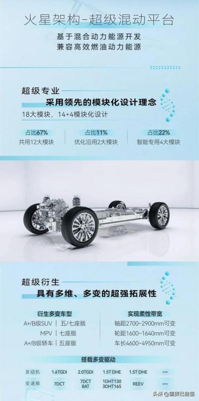 火星架构混动平台具有多维、多变的拓展属性,可以衍生A+/B级SUV五座/七座,轴距;MPV七座;A+/B级轿车。2700-2900mm、轮距1600-1640mm、车长4600-4950。火星架构才是奇瑞真正的架构平台,支持多种类似、结构、大小车型开发