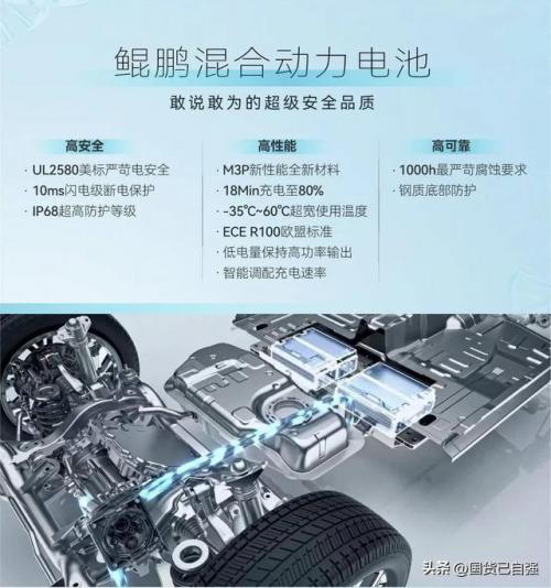奇瑞混合动力电池命名:鲲鹏混合动力电池。技术特点有高性能:M3P高性能材料、18min充电至80%、-35℃-60℃超宽使用温度、ECE R100欧盟标准、低电量保持高功率输出、智能高配重点速度;高安全:UL2580美标严苛安全、10ms闪电断电保护、IP68超高防护等级;高可靠:1000H最严苛腐蚀要求、钢质底部防护。