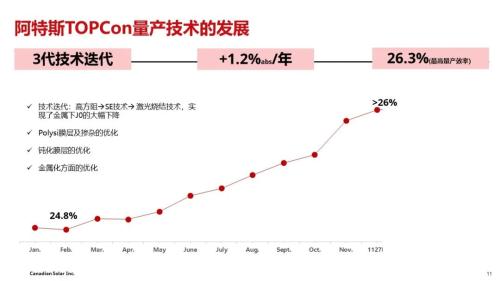 TOPCon电池具有高效率、低成本等优势,使得它迅速成为继PERC之后的下一代主流技术。在过去的两年里,阿特斯TOPCon量产技术经过3代技术更迭,从高方阻到SE技术,再到激光烧结技术,实现了效率的大幅提升,2023年年度效率提升达到了1.2%,最高量产效率达到26.3%的水平。