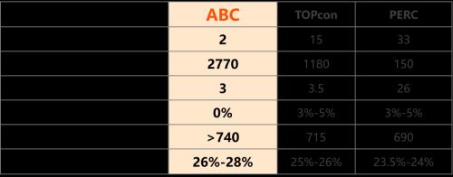 与传统电池技术相比,爱旭N型ABC的前表面复合电流仅为2fA/cm2,TOPCon则为15 fA/cm2;由于金属结构集中于背面,N型ABC电池硅片电阻率更高,电池体寿命也更高;N型ABC正面无栅线,直接将传统技术3%-5%的前表面遮挡降为零,从而提升转换效率。