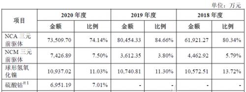 截止2020年末,NCA三元前躯体业务营收占比74.14%,为公司主要收入来源。另一三元前驱体路线NCM业务营收占比7.5%,尚处于发展初期,营收占比较小。球形氢氧化镍业务近三年营收占比维持在11%左右。