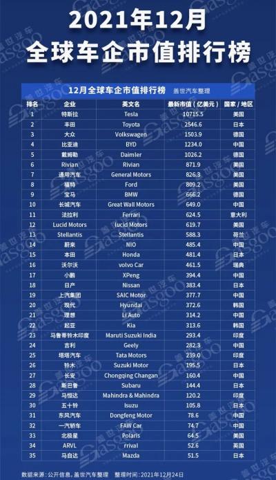 12月30日,盖世汽车搜集整理了2021年度全球汽车市值的排行榜单。在这份最新的市值排行榜单之中,前五的排名没有发生太大的变化,但是再看前十,就会发现一个新的面孔――美国新创造车企业Rivian,这一尚未正式上市它首款皮卡车的品牌,市值直接飙升到第6位,看来资本市场确实很看好。