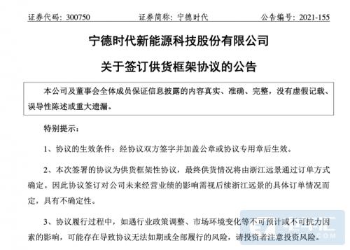 电车汇消息:12月30日,宁德时代发布公告称,与浙江远景汽配有限公司(“浙江远景”)签订《关于供需联动和产能保证的商务协议》(“协议”)。协议中约定,宁德时代将在2022年至2026年期间向浙江远景供应动力电池产品,合计采购量不低于57GWh。