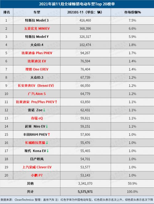 2021年11月全球Top 20电动车榜单:特斯拉Model Y勇夺销冠,比亚迪海豚首次上榜