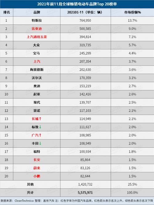 11月全球Top 20电动车品牌榜:中国品牌占半数席位
