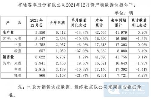1月5日,宇通客车披露2021年12月份产销数据快报,生产量5556辆,同比下降13.35%;销售量6622辆,同比下降1.27%。1-12月,累计生产量4.21万辆,同比增长0.20%;累计销售量4.18万辆,同比增长0.17%。