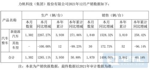 1月4日,力帆科技公布2021年12月产销快报,其中,当月生产新能源汽车1302辆,同比增长2267.27%;新能源汽车销售1840台,同比增长1528.32%。1-12月,生产新能源汽车3938台,同比增长271.86%;销售新能源汽车3810辆,同比增长258.42%。