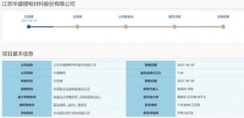7月1日,资本邦了解到,江苏华盛锂电材料股份有限公司(下称“华盛锂电”)闯关科创板IPO获上交所受理,本次拟募资7亿元。