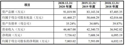 财务数据显示,公司2018年、2019年、2020年营收分别为3.69亿元、4.23亿元、4.45亿元;同期对应的净利润分别为6,095.19万元、7,608.34万元、7,736.62万元。