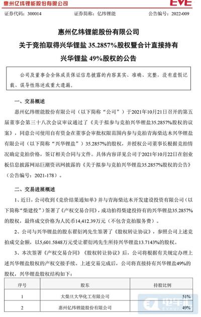 电车汇消息:1月12日晚间,亿纬锂能发布公告,公司于2021年10月21日召开的董事会审议通过了《关于拟参与竞拍兴华锂盐35.2857%股权的议案》,同意公司使用自有资金在董事会审批权限范围内参与竞拍青海柴达木兴华锂盐有限公司(以下简称“兴华锂盐”)35.2857%的股权,并授权公司董事长根据竞拍情况确定竞拍价格,签订相关合同与文件。