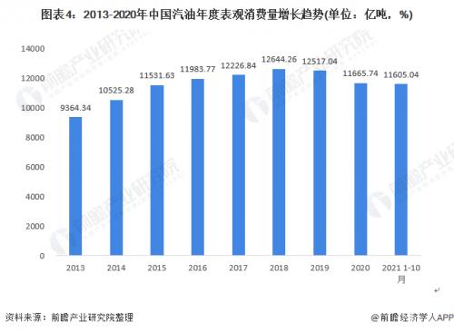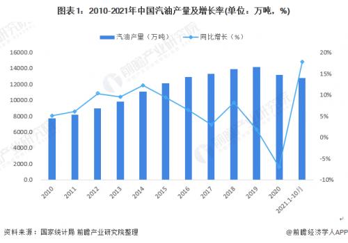2020年受疫情的冲击,汽油市场需求大幅下滑。2020年全国汽油产量为13179.7万吨,同比下降7.03%。全年来看,中国成品油产量低位出现在第一季度,由于2020年春节假期延长,疫情蔓延令众多炼厂开工负荷迅速下滑,主营单位和山东独立炼厂均在一季度迎来年内低点。2-3月份因疫情全国处在封锁状态,3月份汽油产量最低,后随着复产复工,汽油产量逐渐增加,基本恢复至往年同期水平。2021年1-10月,汽油产量达12752.8万吨,同比累计增长17.8%。
