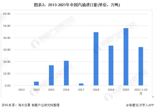 我国汽油进口量变化差异较大,主要是国家根据市场供求状况适度调节以及适时加大汽油资源战略储备的结果。2020年我国汽油进口48万吨,同比增长44.09%。2021年1-10月进口量32.24万吨。