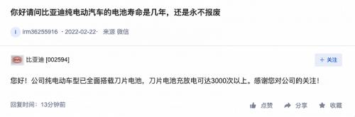 3月15日,比亚迪在深交所“互动易”平台回答投资者提问时称:公司纯电动车型已全面搭载刀片电池,刀片电池充放电可达3000次以上。
