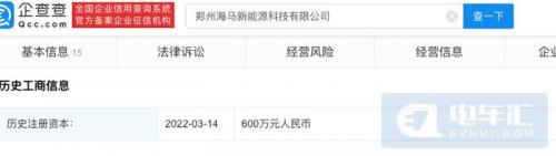 日前,据企查查App显示,郑州海马新能源科技有限公司于3月14日发生了工商变更,注册资本由原来的600万元人民币增至5.57亿元,增幅为9183.3%。资料显示,该公司成立于2021年,法定代表人为孙忠春,主营范围包括:技术服务、技术开发;汽车零部件研发;汽车新车销售;新能源汽车整车销售等,由海马汽车间接全资控股。