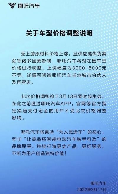 “受上游原材料价格上涨,且供应链供货紧张等诸多因素的影响,哪吒将对在售车型价格进行调整”,哪吒汽车称。