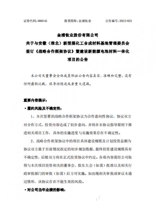 金浦钛业表示,本协议的签署,符合公司的战略发展规划,对于公司开拓新能源业务领域具有积极的推动作用,有利于提升公司竞争力和行业影响力,有利于公司长期可持续发展,对公司长期经营的影响视后续具体业务合作的推进和实施情况而定。