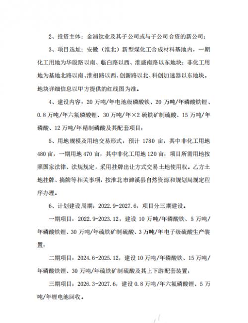公告显示,项目计划建设周期为2022年9月至2027年6月,分三期建设。一期将建设10万吨/年磷酸铁、5万吨/年磷酸铁锂、30万吨/年硫铁矿制硫酸、3万吨/年电子级硫酸生产装置;二期将建设10万吨/年磷酸铁、15万吨/年磷酸铁锂、30万吨/年硫铁矿制硫酸及其上下游配套装置;三期将建设0.8万吨/年六氟磷酸锂、5万吨/年锂电池回收。