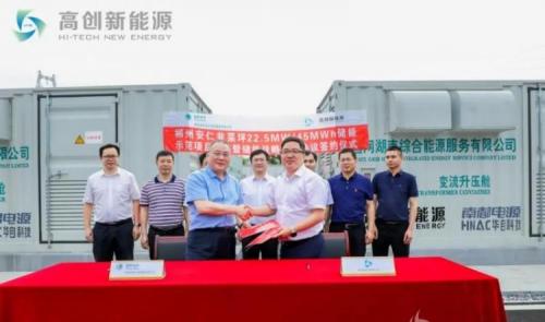 2021年6月22日,湖南高新创投集团下属高创新能源公司(简称“高创新能源”)郴州韭菜坪储能电站项目投产暨战略合作协议签约仪式在湖南省郴州市安仁朴塘村110kV韭菜坪电站内举行。安仁县委副书记陈建新、常务副县长侯志武、国网湖南综合能源有限公司(简称“国网湖南综能公司”)董事长谢学渊、高创新能源董事长杨翊出席。