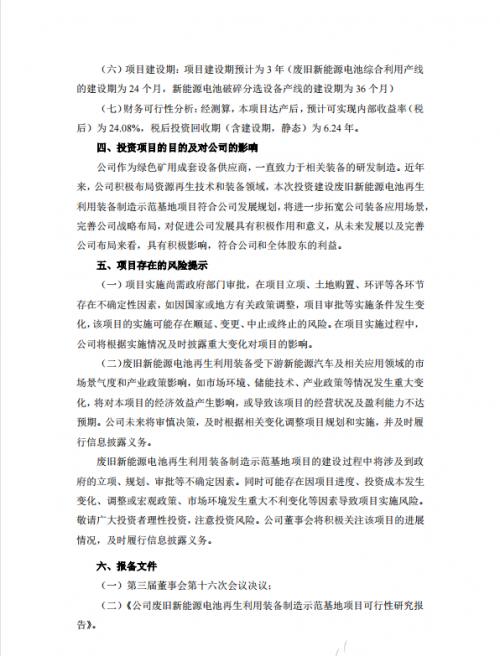 公告显示,该项目建设期预计为3年。其中废旧新能源电池综合利用产线的建设期为24个月,新能源电池破碎分选设备产线的建设期为36个月。