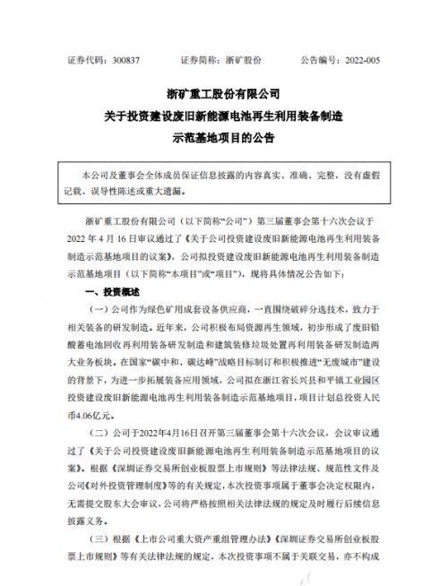 对于本次投资,浙矿股份表示建设废旧新能源电池再生利用装备制造示范基地项目符合公司发展规划,将进一步拓宽公司装备应用场景,完善公司战略布局及对促进公司发展具有积极作用和意义。
