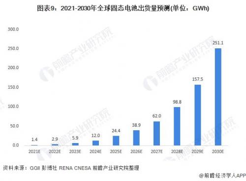 目前,全球企业开始加大固态锂电池方面的研究布局,加上各国政策的推动下,固态锂电池产业化进程有望加快。预计2021-2030年全球固态电池出货量高速增长,至2030年或将突破250GWh。