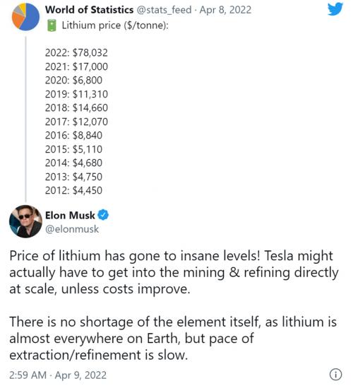 锂是制造电池的关键部件,因为它是最轻的金属,也是密度最小的固体元素,这意味着锂电池具有较高的功率重量比,这一点在运输过程中非常重要。然而随着电动车对锂离子电池的需求不断增加,锂材料的价格也不断飙升。基准矿产情报公司(Benchmark Mineral Intelligence)的数据显示,过去一年里,由于锂开采速度落后于电动汽车的需求,锂的价格上涨了两倍多,面对高昂的成本,就连马斯克也不禁感叹道:锂的价格已经达到了疯狂的水平!