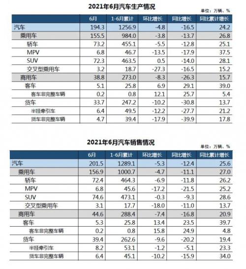 数据显示,6月,乘用车产销分别完成155.5万辆和156.9万辆,环比分别下降3.8%和4.7%,同比分别下降13.7%和11.1%。分车型来看,4类车型产销中除SUV销量同比下降9.3%,其余车型的产销(含SUV生产)同比均呈现两位数下降。与2019年相比,乘用车产销同比下降3%和9.4%,产销增速较5月均由正转负。1-6月,乘用车产销分别完成984.0万辆和1000.7万辆,同比分别增长26.8%和27.0%,增幅比1-5月继续回落12.3和11.1个百分点。与2019年同期相比,产销同比分别下降1.6%和1.4%,其中,产量降幅比1-5月扩大0.2个百分点,销量增速由正转负。