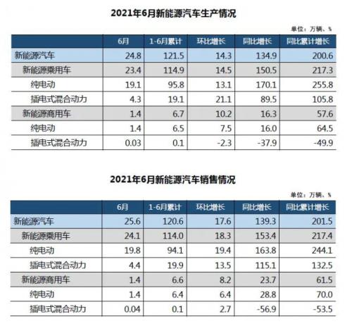 6月,新能源汽车产销分别完成24.8万辆和25.6万辆,同比分别增长1.3倍和1.4倍。6月新能源产量刷新当月历史记录,新能源销量则刷新历史记录,再创新高。其中,纯电动销量、插电式混合动力产销均刷新历史记录。1-6月,新能源汽车产销分别完成121.5万辆和120.6万辆,同比均增长2倍,目前新能源汽车累计销量已与2019年全年水平持平。