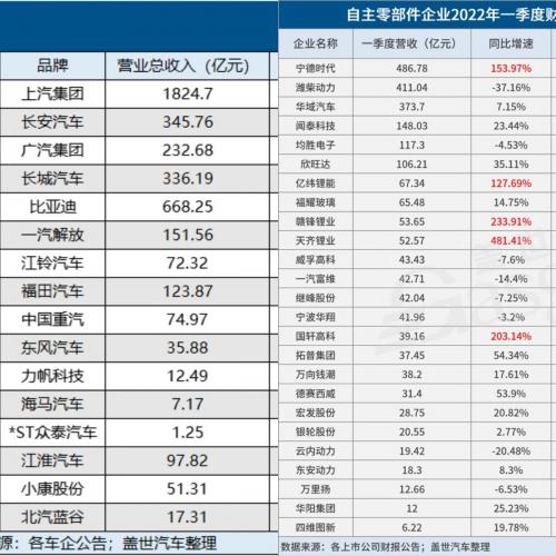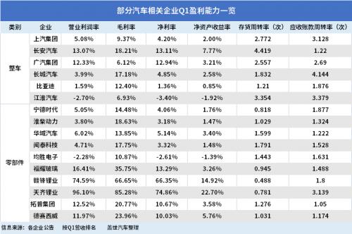 但事实真是如此吗?盖世汽车选取了整车和零部件部分龙头企业的一季度财报进行对比分析,涉及整车生产、电池、能源金属、汽车部件与研发、智能网联等多个领域。