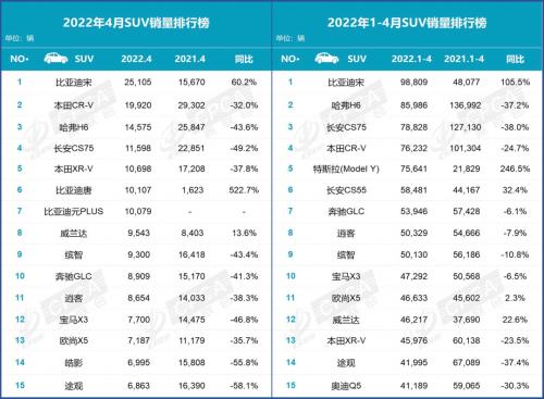 据全国乘联会公布的销量数据,4月份SUV销量中,比亚迪宋以25,105辆成为销量冠军,而哈弗H6仅有14,575辆,排名第三;1月至4月,比亚迪宋累计销量为98,809辆,同比增长105.5%,是SUV市场的销量冠军,而哈弗H6累计销量为85,986辆,同比下跌37.2%,排名第二。
