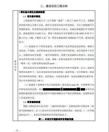 据上海企事业单位环保服务平台,5月23日,该平台发布了“上海蔚来汽车有限公司新建研发项目环境影响报告表报批前公示”(以下简称“公示”),公示显示蔚来汽车计划在上海市嘉定区安亭镇新建研发项目,具体建设内容如下: