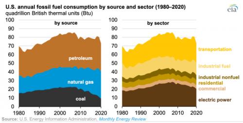 这是自1949年以来美国化石燃料消耗量以绝对值和百分比计算的最大年度下降,主要是受到2020年COVID-19疫情的影响,美国运输业能源消耗减少了15%。美国2020年冬天整体相对温和,减少了对取暖燃料的需求。