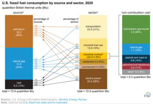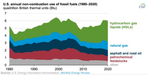 2020年,化石燃料的非燃料使用量约占美国化石燃料消耗量的8%,直接用作建筑材料、化工原料、润滑剂、溶剂和制蜡。