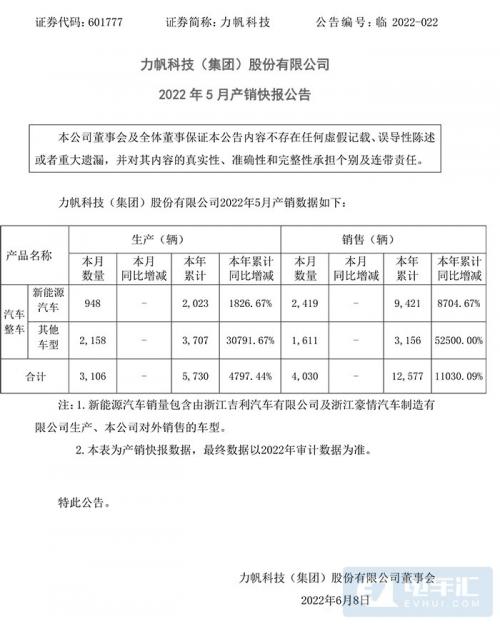 6月7日,力帆科技公告,公司2022年5月汽车销量4030辆,其中:新能源汽车销量2419辆;前5月汽车销量1.26万辆,同比增长11030.09%,其中:新能源汽车销量9421辆,同比增长8704.67%。