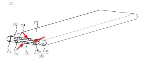 1)口琴管式的冷却板实际上是双层结构。下图中371为内层冷却通道,372为外层冷却通道,373为加强结构,其中373a,373b均为冷却内的加强筋。加强筋进一步加强了冷却液通道的结构强度,可以防止在外力的作用下,冷却通道变形甚至破裂。