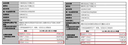 《投资者网》梳理信息发现,2021年,壹连科技旗下子公司宁德壹连、溧阳壹连的营收合计为11.75亿元、净利润合计为0.89亿元,同期,为壹连科技贡献了总营收比重的81.94%,及净利润比重的64.03%。