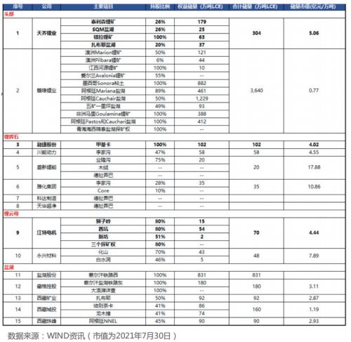 永兴材料:1)化山(70%):储量61万吨LCE,品位0.38%;2)白水洞(46%):储量11万吨LCE,品位0.38%。