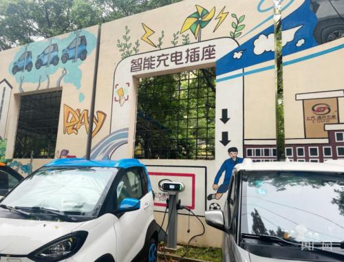 在柳州市海关路新能源汽车专用停车点,智能充电插座(充电桩)分布在炫酷的涂鸦墙上,既给车主提供了停车、充电的方便,也为这座工业之城增添了新潮的城市文化色彩。