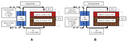 为了最大限度地提高动力循环的运行效率,需要尽可能维持在循环设计点附近工作。对于超临界二氧化碳布雷顿循环,涡轮入口温度约为650 °C至750 °C,压力约为20-25Mpa。目前聚光太阳能电站使用的大部分储热方式是熔盐中的直接显热储存,需要两个分别用于蓄冷和蓄热的储罐,并且传统熔盐材料存在热稳定性不佳的问题。尽管使用氯化盐可以解决温度限制的问题,但是具有较强的腐蚀性,需要使用特殊的罐体材料。另一种储热方式是使用固体材料进行显热储热,例如岩石,但是这种方式将导致能量密度低,随着释能过程进行,出口温度出现衰减,导致耦合热力学循环的效率降低。