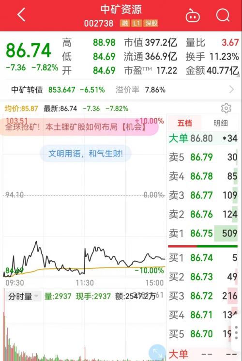 受此突发消息影响,早盘三家公司股价均大幅低开,其中,中矿资源一度跌停。截至收盘,中矿资源报收86.74元,股价下跌7.82%,换手率达到11.23%,市值仅397.2亿元。