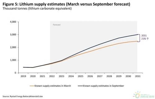早在今年3月,睿咨得能源就预测,到2030年,锂矿物的估计总产量将略低于250万吨LCE。今年9月,睿咨得能源最新预计,到2030年锂矿物的总产量将达到300万吨LCE。随着更多的项目从最初的勘探转向了实质性的勘探,产量也随之增长。在睿咨得能源最新预测中,2031年的锂矿已知总供应量比2031年3月的供应量高21%,因为在过去6个月里已宣布增加和加速勘探进展的项目的预计产能和产量不断更新(见图5)。