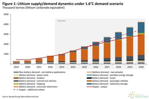 据测算,2021年市场对磷酸铁锂电池的需求强劲复苏,使得碳酸锂的供应日趋紧张。据睿咨得能源测算,2025年之前最大锂供应缺口或将出现在2022年,之后锂价格坚挺引发的产量增加和项目重启或将有助于缩小2023年的锂供应缺口。预计2024年的锂供应缺口将比2023年的水平略有扩大;预计从2025年开始,锂或将面临日益严重的短缺;预计到2030年,缺口或将接近85万吨碳酸锂当量(LCE)。
