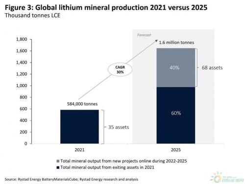 与其他电池矿物(钴和镍)相比,锂矿中处在勘探状态的项目远远多于在产项目,锂资源具有较大潜力。睿咨得能源预测,到2021年,35个在产锂矿项目总产量约为58.5万吨LCE(碳酸锂当量),到2025年,或将会有103个在产项目,总产量可能增至165万吨LCE,这其中包括将在2022至2025年开始投产的68个项目,预计将占到2025年锂矿总产量的40%(见图3)。