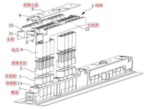 如该专利所述,将原来横梁Z向掏空,形成电芯容纳腔,然后将电芯放入容纳腔中,排成一横排。再配上CCS和上盖,形成一个以横梁底部为底板,利用原来横梁所占的Z向空间,“生成”了一个完整的圆柱小模组,最终进一步提高电池Pack系统的体积能量密度。