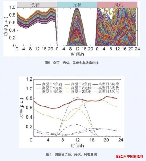 前述对时序曲线进行聚类是因为若以全年时序负荷、风电、光伏功率进行优化会存在求解规模过大的问题,考虑到负荷、风电、光伏功率有明显的季节性,可采用K-means聚类方法得到典型日功率曲线来表征全年的功率曲线。聚类步骤:首先,随机选择D个初始聚类质心(规划典型日);其次,对年时序功率曲线以日为单位划分的365个聚类单元进行聚类;最终,得出D种规划典型日以及各典型日的对应天数。利用典型日的功率数据进行后续优化可大幅降低求解规模,缩短求解时间。