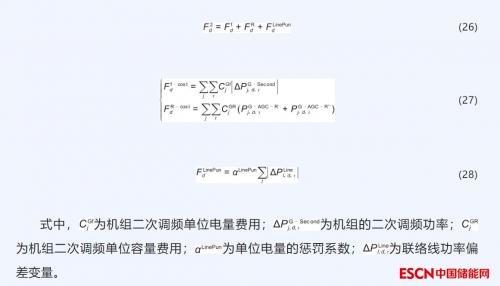 电力系统由多个控制区互联组成,各互联系统的静态频率保持一致,在调度管理上各区域的源荷功率平衡应由本区域自己解决,也就是说当某一区域发生功率不平衡时,在保证系统频率在正常范围的前提下,联络线交互功率稳态值应与计划值一致。对此,调频阶段目标函数包含联络线交互功率偏差惩罚函数,以保证区域间联络线有功交换符合系统安全优质运行要求。目标函数见式(26),具体包含机组二次调频电量费用图片和容量费用图片,以及联络线的偏差惩罚图片。