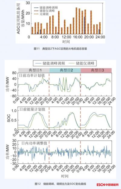 方案1和方案2下储能系统调峰、调频出力及SOC变化曲线如图12所示,图中方案1和方案2的储能日前运行并不相同,可知考虑储能频率响应会影响储能日前调峰运行。典型日2下AGC征用的火电机组总容量如图11所示,方案1、方案2和方案3均能使系统频率和区域联络线传输功率保持在正常区间内,方案2的AGC征用容量与方案3基本相同,说明储能若不参与调频,则系统的频率调整均由常规机组完成;方案1的AGC征用容量远小于方案2,说明储能响应ACE信号可以减少常规机组的功率调整。结合表3,因为储能系统调频比火电机组调频的成本更低,因此方案1系统调频成本更低,综上,在规划阶段考虑储能调峰调频运行可以更好匹配系统的实际储能需求。