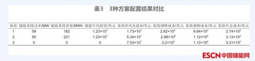 3种方案下运行成本如表3所示,方案1储能系统配置功率比方案2高图片,配置容量低图片,储能年均成本低图片,这是因为需要更大的储能功率参与系统调频响应。方案1由于配置的容量相较于方案2更低,且单位容量价格比单位功率价格更高,因此储能年均投资成本更低。方案1对比方案2和方案3大幅降低了系统的弃负荷成本,可见储能系统能有效消纳新能源,减少了弃风光成本。方案1的系统调峰成本相较于方案2和方案3分别下降了12%和18%,调频成本下降了91%,储能系统大幅降低了系统的调峰调频成本。综合以上所有成本,方案1的系统年均总成本比方案2低图片,比方案3低图片,储能系统参与双重应用场景比单一场景和无储能场景系统年总成本更低。