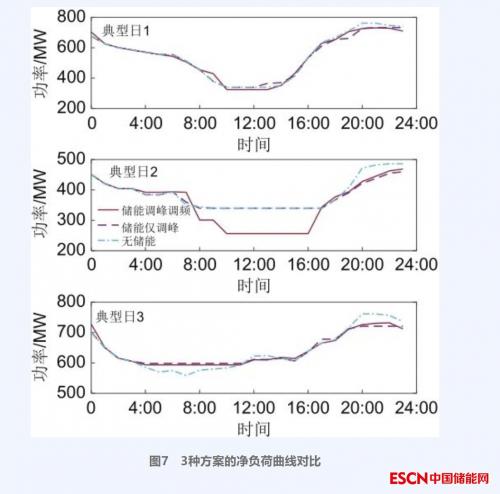 为分析储能系统配置后对系统调峰效果的影响,引入3个方案下净负荷曲线,如图7所示,以各典型日无储能方案作为对比,可看出在18:00~24:00时段,方案1和方案2的系统净负荷更低,且方案1系统净负荷低于方案2系统净负荷,说明考虑调峰调频运行的储能配置相较于方案2、3更有利于削减系统尖峰负荷。典型日3的4:00~10:00时段,方案1和方案2的系统净负荷高于方案3的系统净负荷,说明配置的储能填补了系统负荷缺额,此时储能系统作为负荷吸收电网电能进行充电。典型日2的7:00~17:00时段,方案1系统净负荷低于方案2、3的系统净负荷,这是因为典型日2的风光出力大幅高于典型日1、3出力,系统净负荷低体现了储能在系统中发挥了调峰的作用。